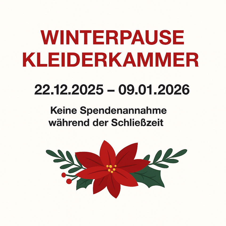 Von Montag, 22. Dezember 2025 bis Freitag, 09. Januar 2026 bleibt die Kleiderkammer geschlossen.